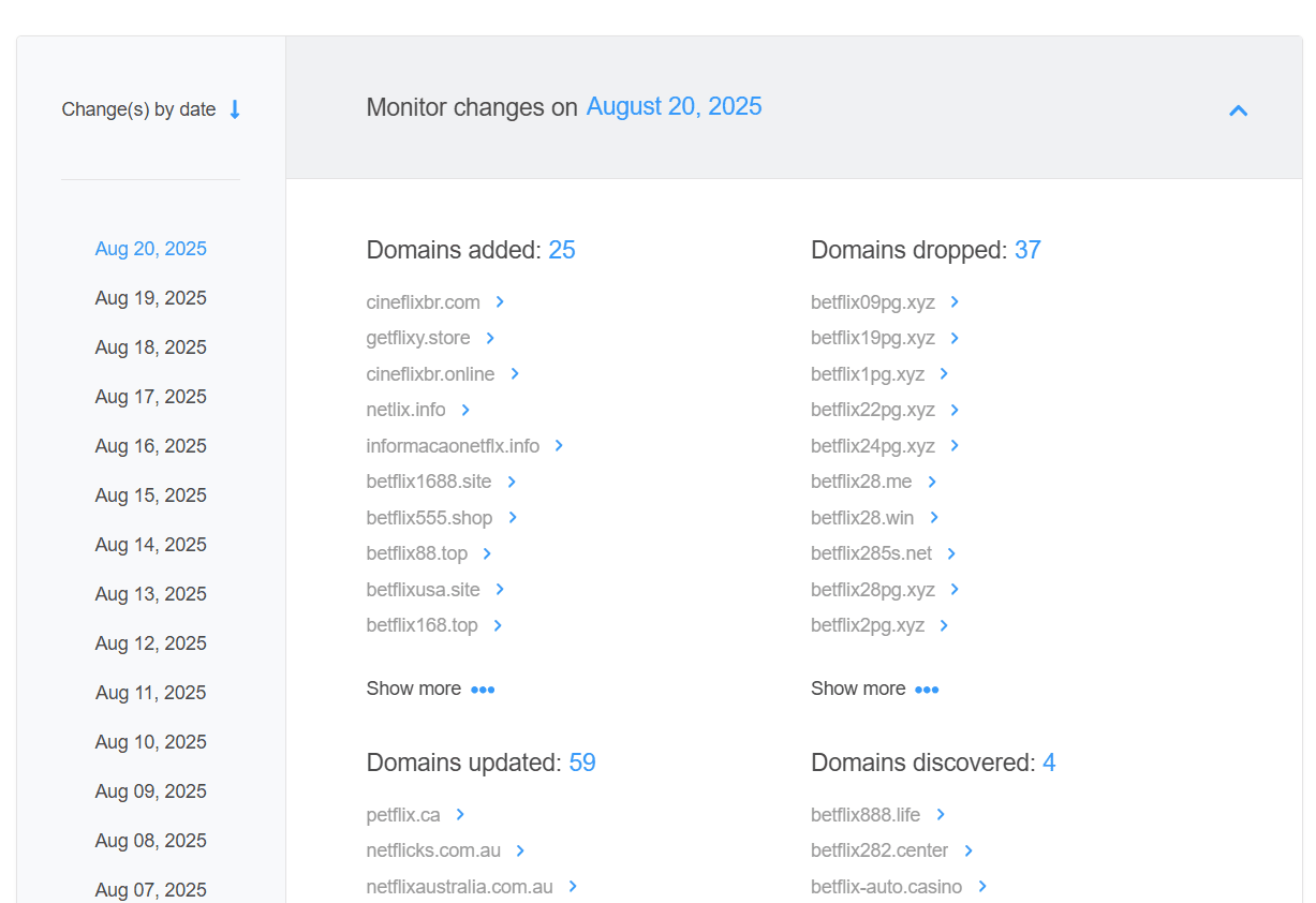 Brand monitoring services like WhoisXML API’s Brand Monitor can alert you when someone registers a domain that closely resembles your domain name. Here’s an example of a brand monitor we set up for Netflix, which showed that 25 look-alike domains were added in one day alone.